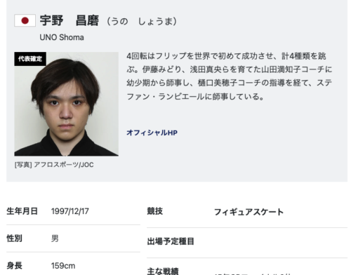 • 宇野昌磨さんの公式プロフィール身長は158cmとされている